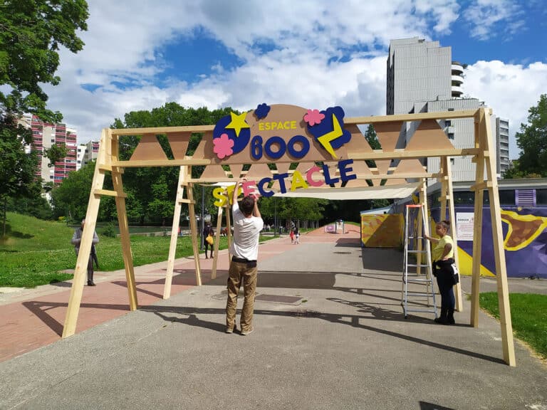 La Miny Fabrique nous accompagne depuis plusieurs années sur différents chantiers participatifs. L’équipe a été présente plusieurs étés pour construire du mobilier extérieur (des transats, des parasols, une arche…), mais aussi un espace pour le chantier ados sur la mezzanine devant l’Espace 600 (« la cabane de l’Espace »)